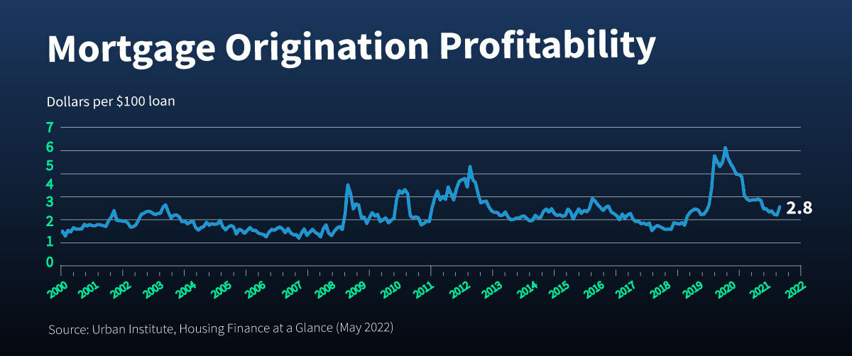 2022 is a different story. In a rising rate environment, consumer mortgage volumes are declining, and so is profitability. According to a May 2022 report by the Urban Institute, mortgage origination profitability is down to 2.8% in 2022 from the dizzying peak of 6% in 2020. This slowdown has forced originators to compete more aggressively on terms.