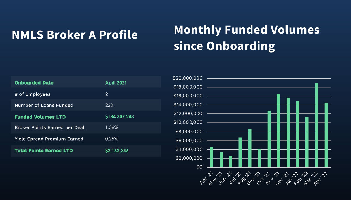 An NMLS broker who first partnered with us in April 2021 quickly recognized an opportunity to originate and cross-sell real estate investor loans to landlords that they were previously unable to lend to. In just one year through April 2022, they were able to fund 220 loans with Roc Capital’s help – a total volume of over $134 million. They earned 1.36% in broker points per deal, with a yield spread of 0.25%. Not bad for a new business opportunity! Check out the numbers: