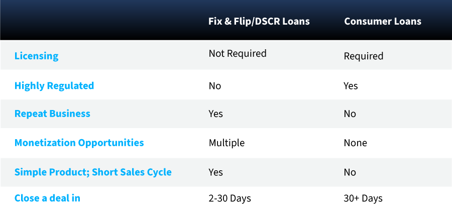Not only does the outlook for real estate investor loans continue to remain strong, look how much easier life is on this side of the fence. Indeed, the regulatory environment, competitive landscape, ease of doing business, and multiple monetization opportunities are all highly attractive features. We can help you expand your product offering and grow your revenues:
